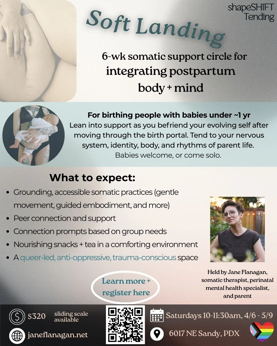 It can take a lot of work to become a parent…and even then, who are we really becoming? Parenthood both gets folded into our previous selves AND transforms us overall. In this group, we’ll be amongst peers of new birthing parents who are exploring our identities, felt senses, and new realities to compassionately make space for the people we are emerging into. With creative prompts, gentle embodied movement, and supported community, we’ll craft a clearer way for all of us to feel more affirmed, welcomed, and liberated in our transforming selves. The beautiful, cozy, and totally baby-friendly space we’ll gather in has just what we need to settle into comfort, simplicity, and ease. Babies are welcome but you may also come on your own. The studio is used for baby/parent groups and is set up for babies to safely lay, roam, and play, and for parents to feel supported to release their bodies and minds into their authenticity.